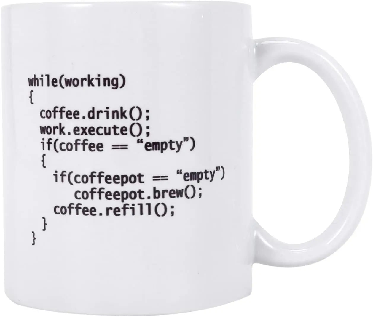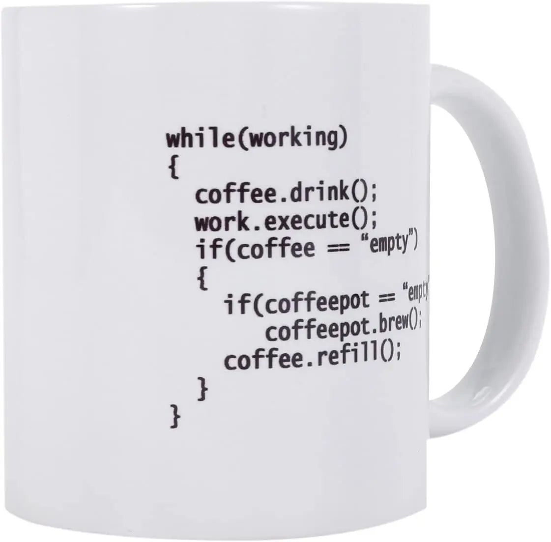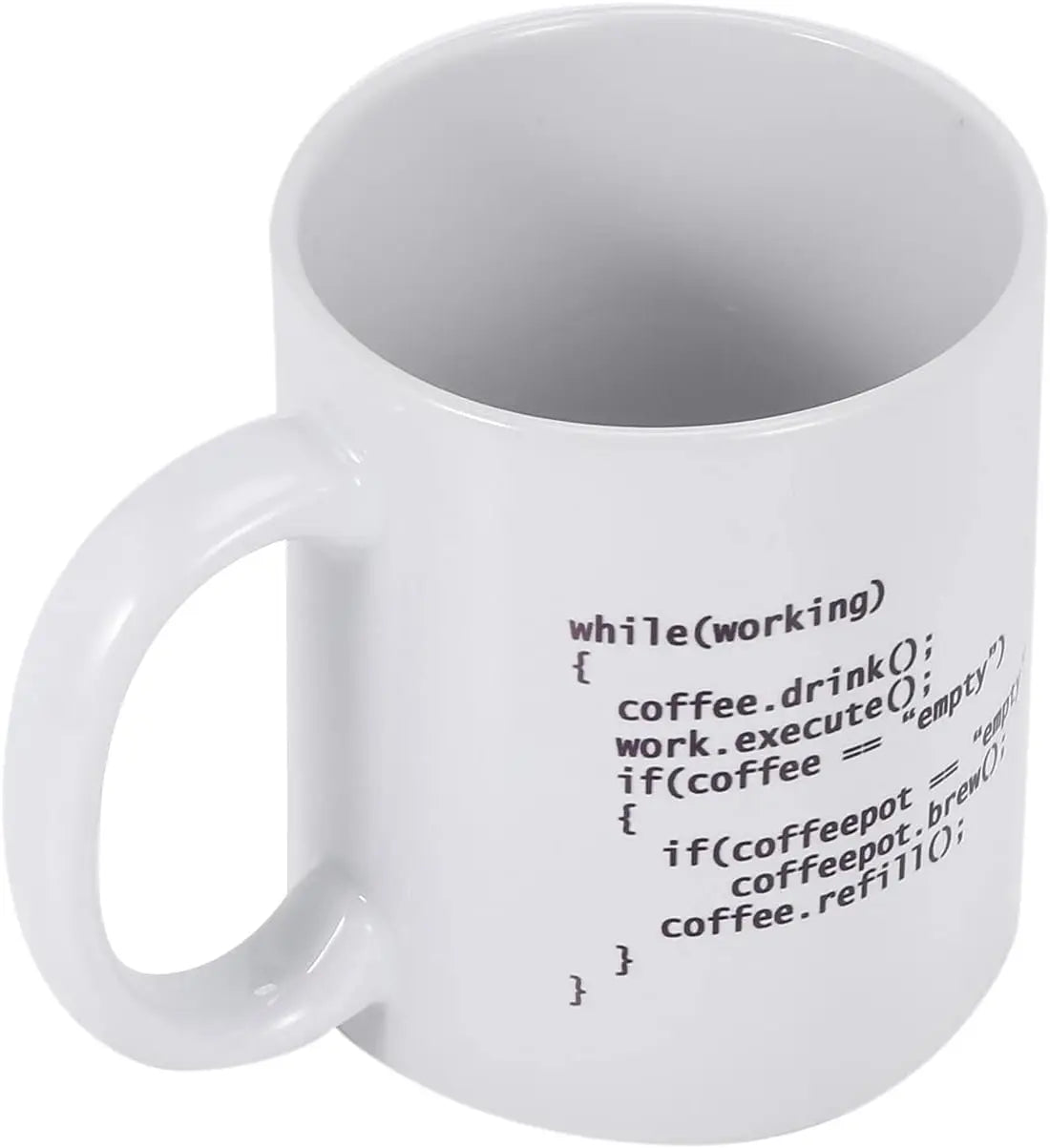 The printed code logic says it all: work only gets done after coffee is consumed (and sometimes brewed from scratch). Whether you're deep into debugging or sprint planning, this mug is the perfect companion for your caffeinated loops.