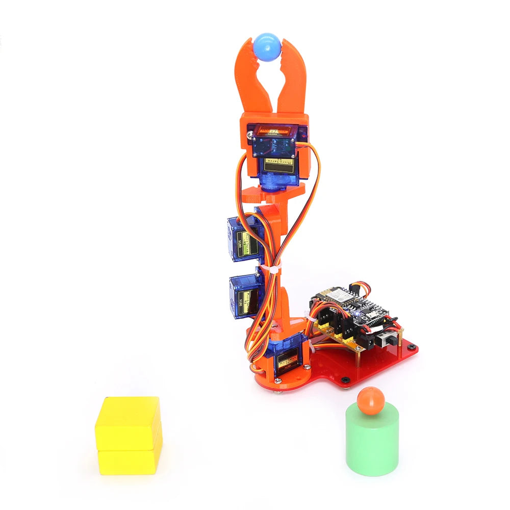 This DIY 5DOF Mechanical Arm Kit features a web-controlled manipulator powered by NodeMCU (ESP8266) and servos (SG90/MG90S). Once connected to your Wi-Fi, simply access the control panel through any browser to command each joint via intuitive sliders.